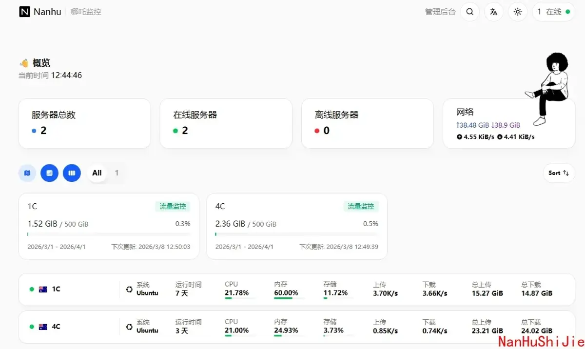 登录哪吒监控面板后,你可以看到所有被监控服务器的实时状态,包括: